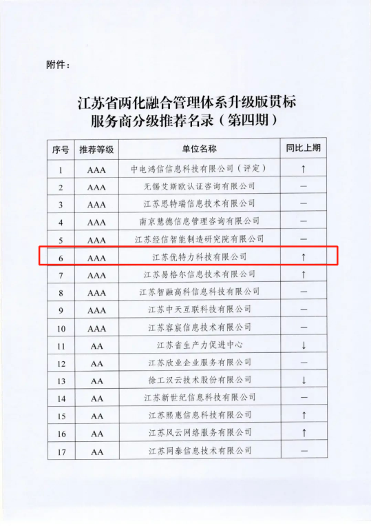 在江蘇省工業和信息化廳的指導下,江蘇省兩化融合貫標咨詢服務聯盟(以下簡稱“聯盟”)前期組織開展了江蘇省兩化融合管理體系升級版貫標服務商分級推薦名錄更新申報工作。經企業申報、聯盟統計、專家評審等環節,江蘇優特力被認定為“AAA級兩化融合管理體系升級版貫標服務商”!