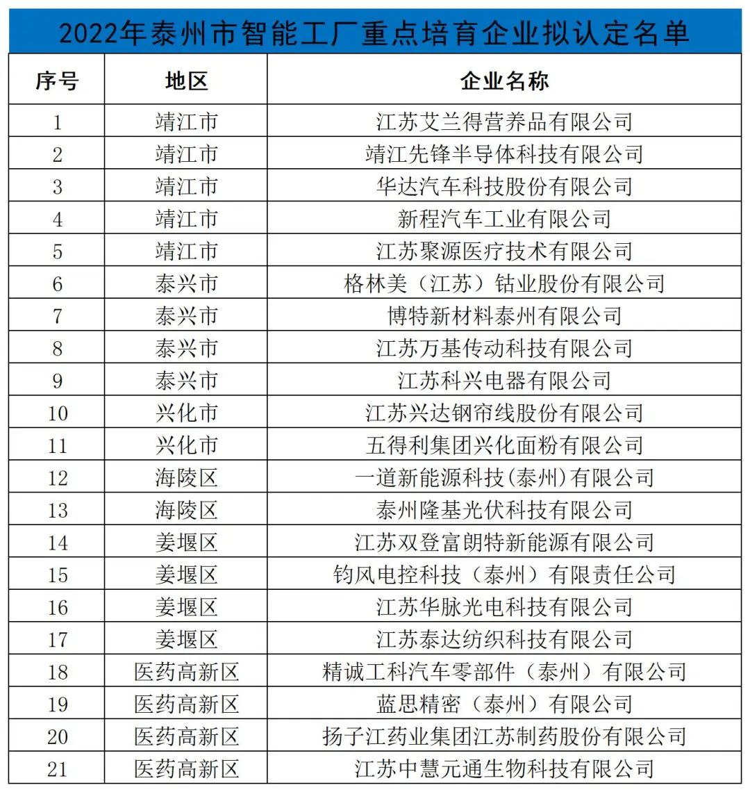 為進(jìn)一步促進(jìn)我市制造業(yè)加快智能化改造和數(shù)字化轉(zhuǎn)型步伐,實(shí)施智能制造示范工廠的梯度培育,我局下發(fā)了《關(guān)于開展2022年泰州市智能工廠重點(diǎn)培育企業(yè)申報(bào)工作的通知》(泰工信發(fā)〔2022〕82號(hào))。經(jīng)企業(yè)申報(bào)、市(區(qū))推薦、形式審查、材料評(píng)審、現(xiàn)場(chǎng)核查、信用查詢等程序,擬對(duì)全市21家企業(yè)進(jìn)行認(rèn)定,現(xiàn)予公示。